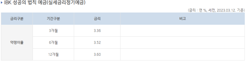 2023년 3월 12일부터 기업은행 성공법(실질세율부과예금)에 따른 정기예금 금리는 다음과 같습니다.