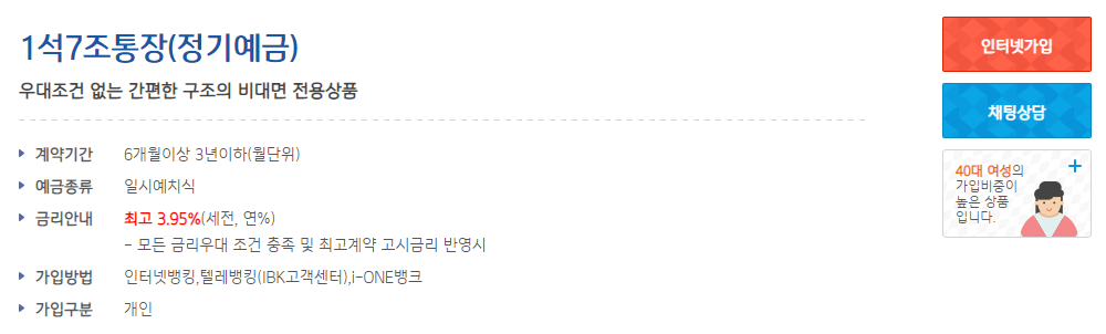 7조 원 규모의 1인용 IBK 통장은 편리한 비대면 정기예금 상품입니다. 1석 7조 상품은 입금기간이 있습니다 6개월 이상 3년 이하로 설정 보증금 100만원 이상계약체결 후 중도해약의 경우에는 만기일에 이자를 지급합니다.