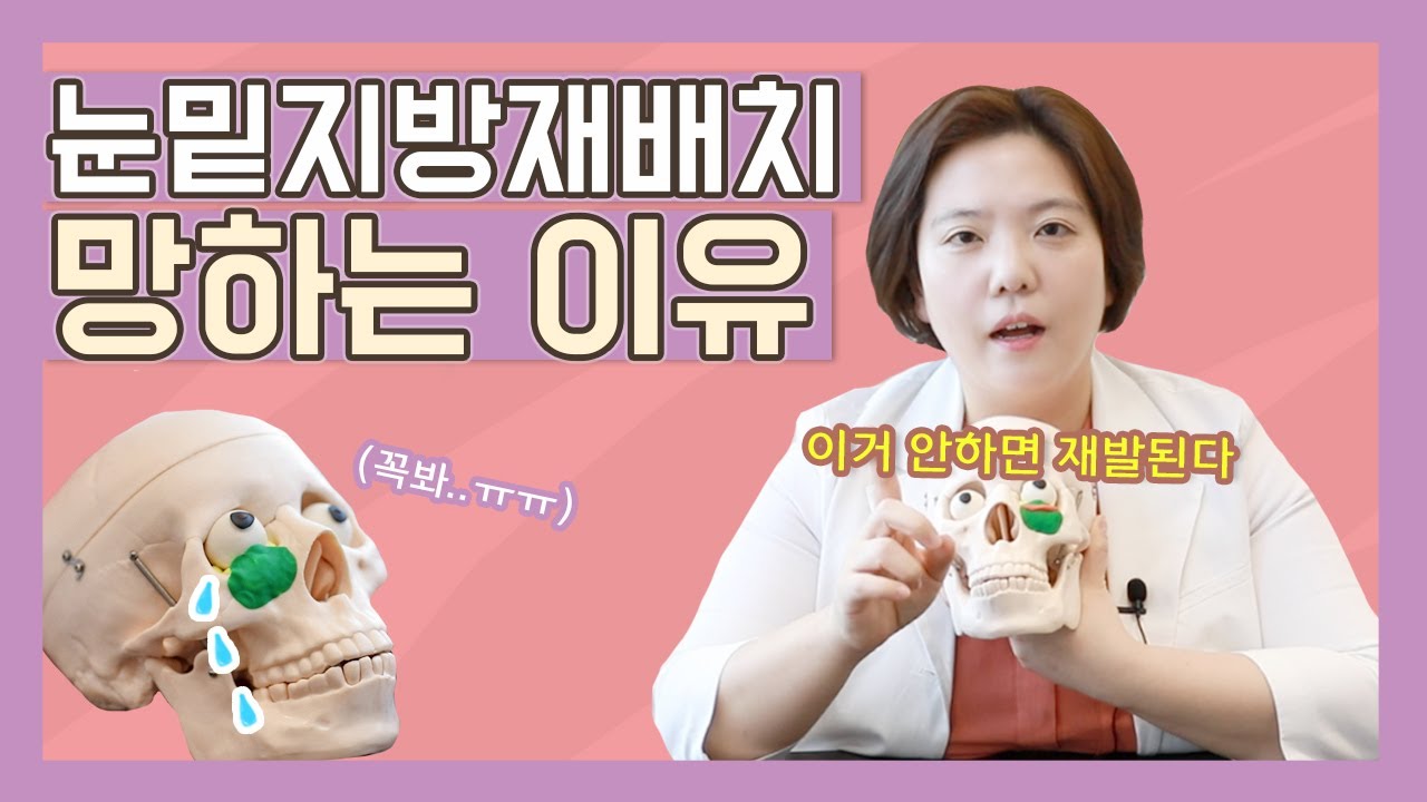 비슷한 이유로 탄력은 충분하지만 여분의 피부가 있는 경우에는 소량의 피부를 절제하는 것이 좋은 해결책이 됩니다.(이때 근육은 전혀 자르지 않고 피부만!) 절제합니다.) 눈 밑 지방 재배치 후 발생하는 눈 떨림간혹 다른 병원에서 눈 밑 지방 재배치 수술 후 눈 근육이 마그네슘 부족처럼 떨리는 것을 느끼고 걱정하시는 분들이 있습니다.이것은 눈 밑의 지방 재배치뿐만 아니라 미세하게 연결된 신경 조직으로 어떤 수술에서도 같은 현상이 일어날 수 있습니다.당장의 불편으로 병원을 방문하실 수 있으나 일정한 회복기간이 지나면 정상적으로 회복됩니다.시술자는 이러한 불편이 일어나지 않도록 주의하여 수술할 필요가 있습니다. 눈 밑 지방 재배치 수술에 대해재발과 눈 떨림에 대해 설명했는데, 가장 일반적인 불만은 어떤 시술자를 만나느냐에 따라 완전히 제거되지 않은 지방이거나 지방을 너무 많이 섭취해서 눈 밑이 갈라져 잘록하게 보일 수 있다는 것입니다.또한 아래 케이스와 같이 눈 밑 지방 재배치를 하더라도 눈 밑의 다크서클이 눈에 띄게 보인다면 지방에 의한 보라색 곰이 아니라 착색에 의한 갈색 곰이므로 앞으로 색소 치료를 추가로 받는 것이 좋습니다.저희 병원 눈 밑의 지방 재배치 케이스입니다. 재발률을 낮추기 위해서는 자신의 눈에 적합한 수술이 눈 밑 지방 재배치인지, 아니면 하안검인지 진단할 수 있는 의료진을 만나는 것이 중요합니다.눈 밑 지방 재배치는 밝은 인상을 갖게 되어 만족감이 높은 수술입니다.본원에서 수술한 환자 케이스의 전후를 아래 링크에서 확인하실 수 있으니 참고하시기 바랍니다.https://youtu.be/MjKfNtcJJBo눈 밑 지방 재배치는 밝은 인상을 갖게 되어 만족감이 높은 수술입니다.본원에서 수술한 환자 케이스의 전후를 아래 링크에서 확인하실 수 있으니 참고하시기 바랍니다.https://youtu.be/MjKfNtcJJBo