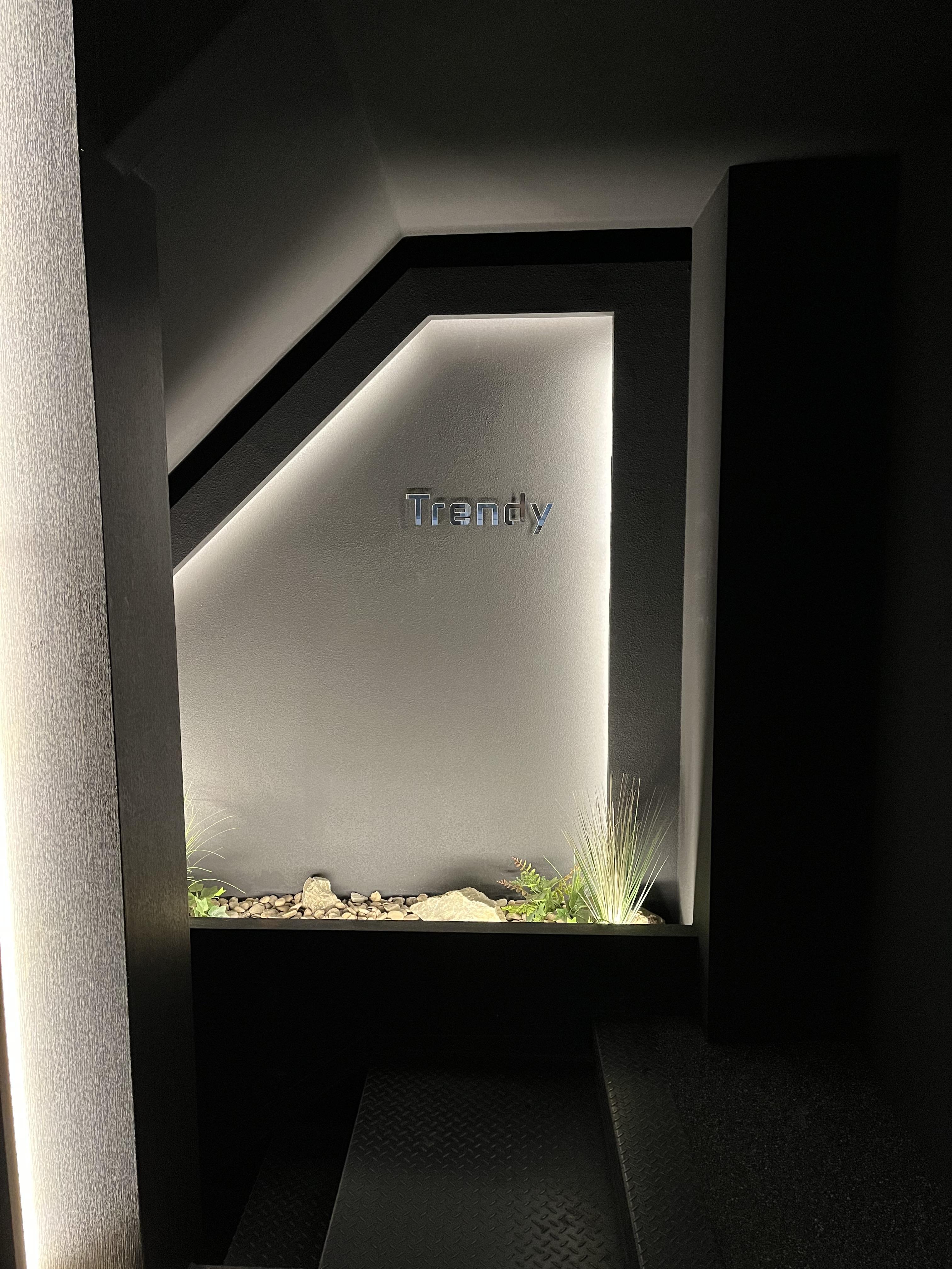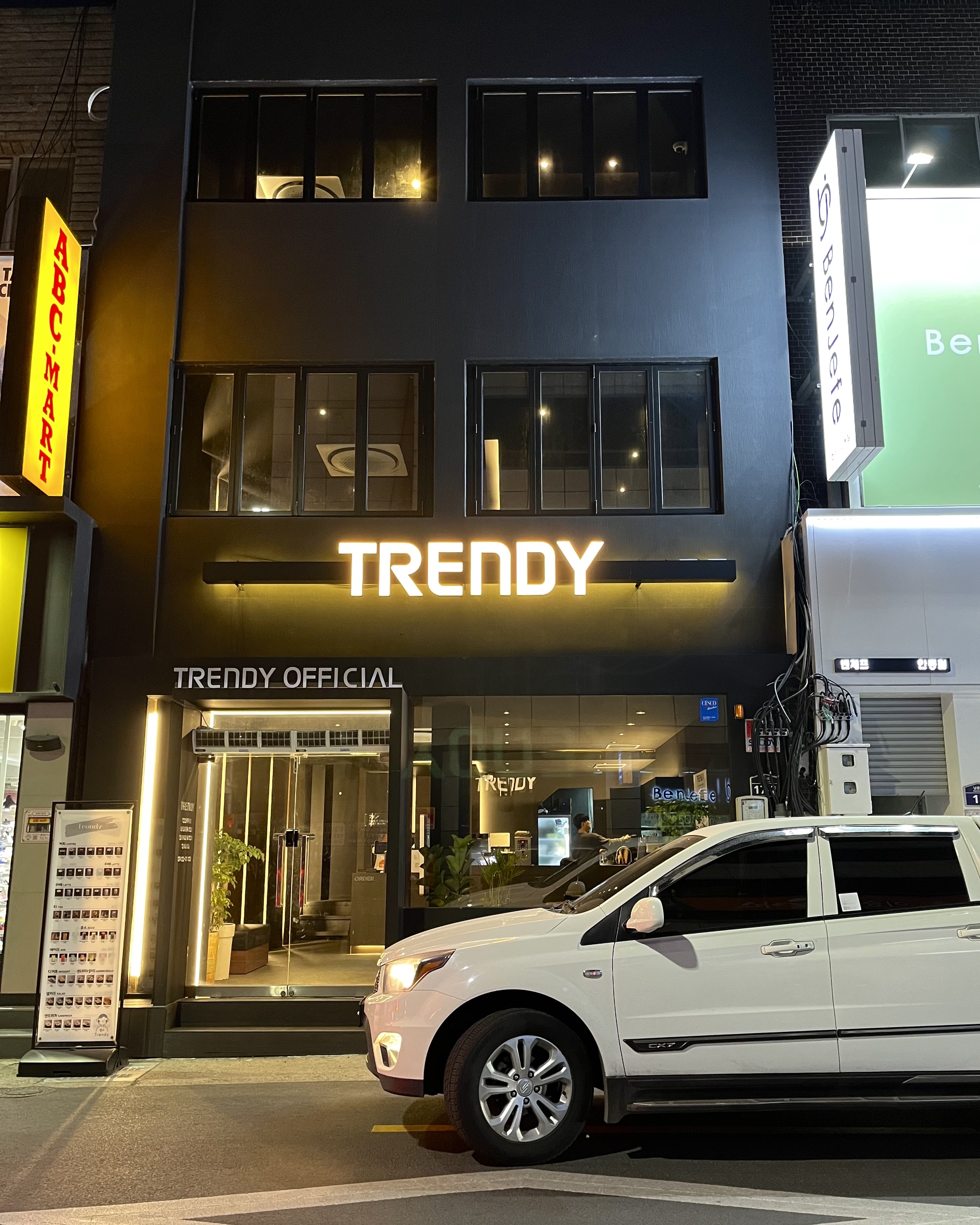 검은색 4층 건물에 빛나는 트렌디한 간판이 여러분을 반깁니다.