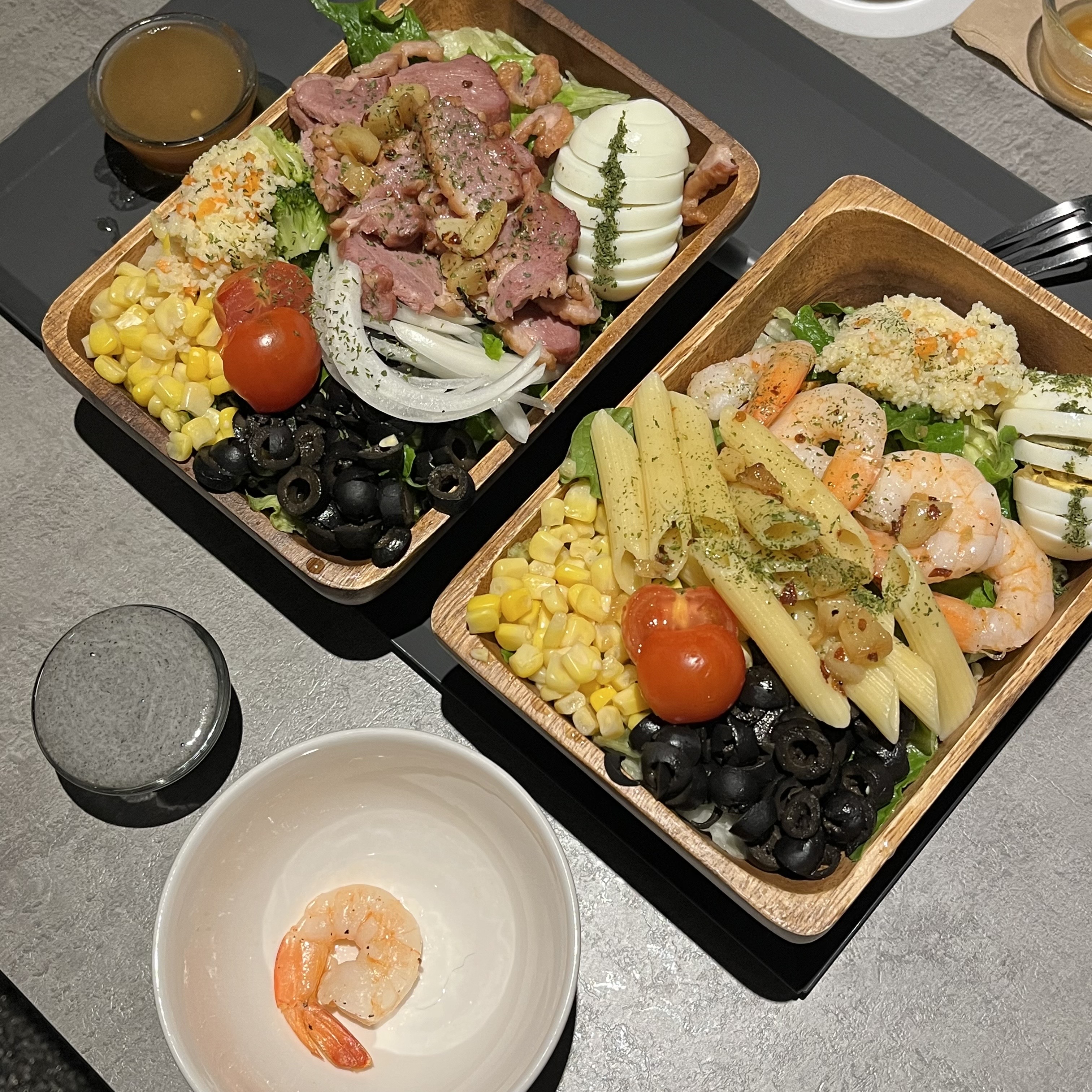 (새우 4마리, 파스타 소량, 양파, 올리브, 양상추, 토마토, 옥수수, 익힌 쿠스쿠스)