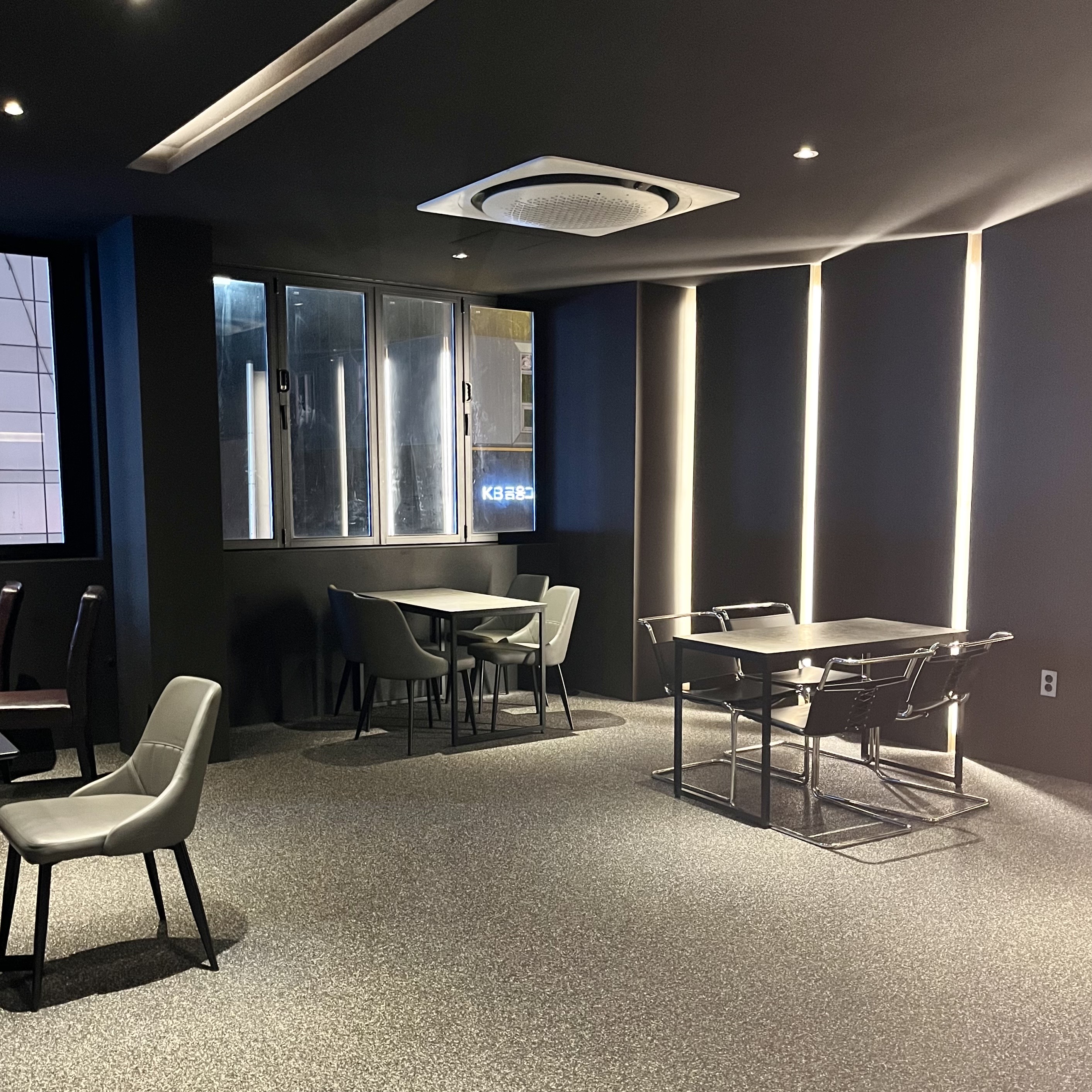 검은색 4층 건물에 빛나는 트렌디한 간판이 여러분을 반깁니다.