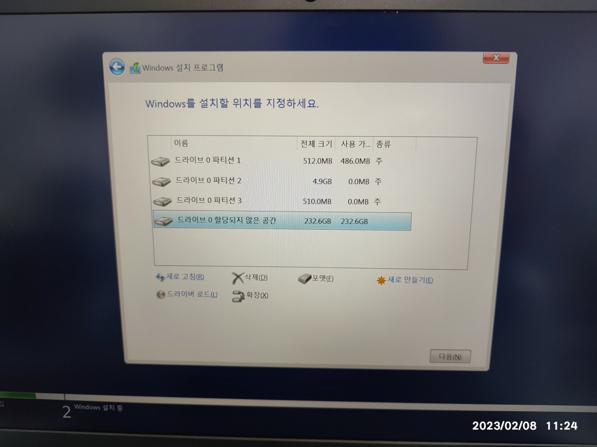 윈도우 설치 화면~에 파티션 구조 확인시도해 볼게. 기존 DOS 파티션 삭제Windows 10 또는 Windows 11을 설치합니다.