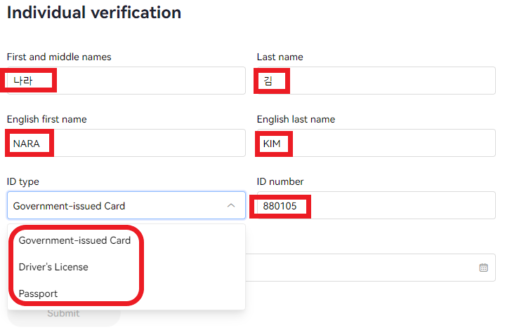 OKX 거래소 KYC 인증의 경우 주민등록증, 운전면허증 또는 여권을 통한 본인 확인이 가능합니다. 본인 확인 절차에서 사용하고자 하는 옵션 중 하나를 선택하여 본인 확인을 진행할 수 있습니다. 선택한 후 ID 번호(생년월일)를 입력해야 합니다. 나. 여권번호, 재류카드번호 또는 운전면허증번호.