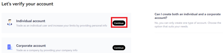 법인회원이 아닌 개인회원의 본인인증을 진행하실 수 있습니다. KYC 인증을 진행하려면 “개인 계정”의 빨간색 상자에서 “계속” 버튼을 클릭합니다.