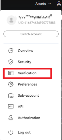 OKX 거래소 등록을 완료한 후 OKX 거래소 메인 페이지로 돌아와서 우측 상단의 사람 모양 아이콘에 커서를 놓습니다. 위와 같이 상세 메뉴가 표시됩니다. 신원을 확인하려면 확인 메뉴로 이동하십시오. KYC 인증을 진행할 수 있습니다.