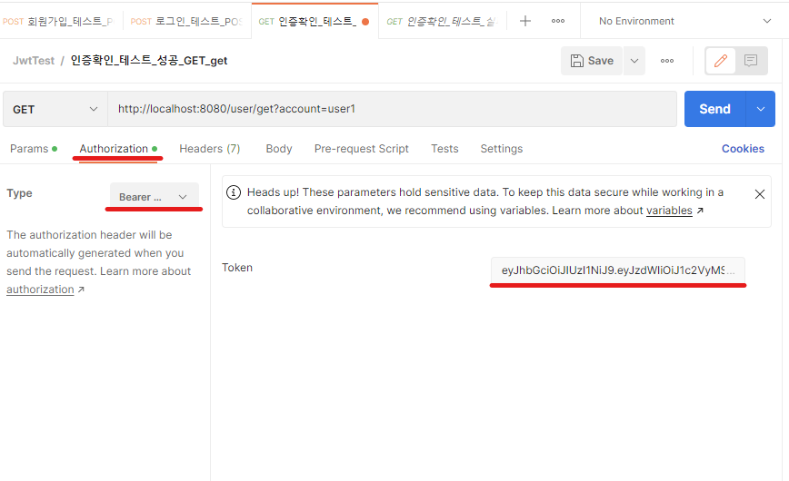 위와 같이 미리 로그인하고 생성된 토큰 값을 Authorization에 입력하지 않으면 인증되지 않은 사용자로 나타나며 account=”user1″에 대한 정보를 조회할 수 없습니다.